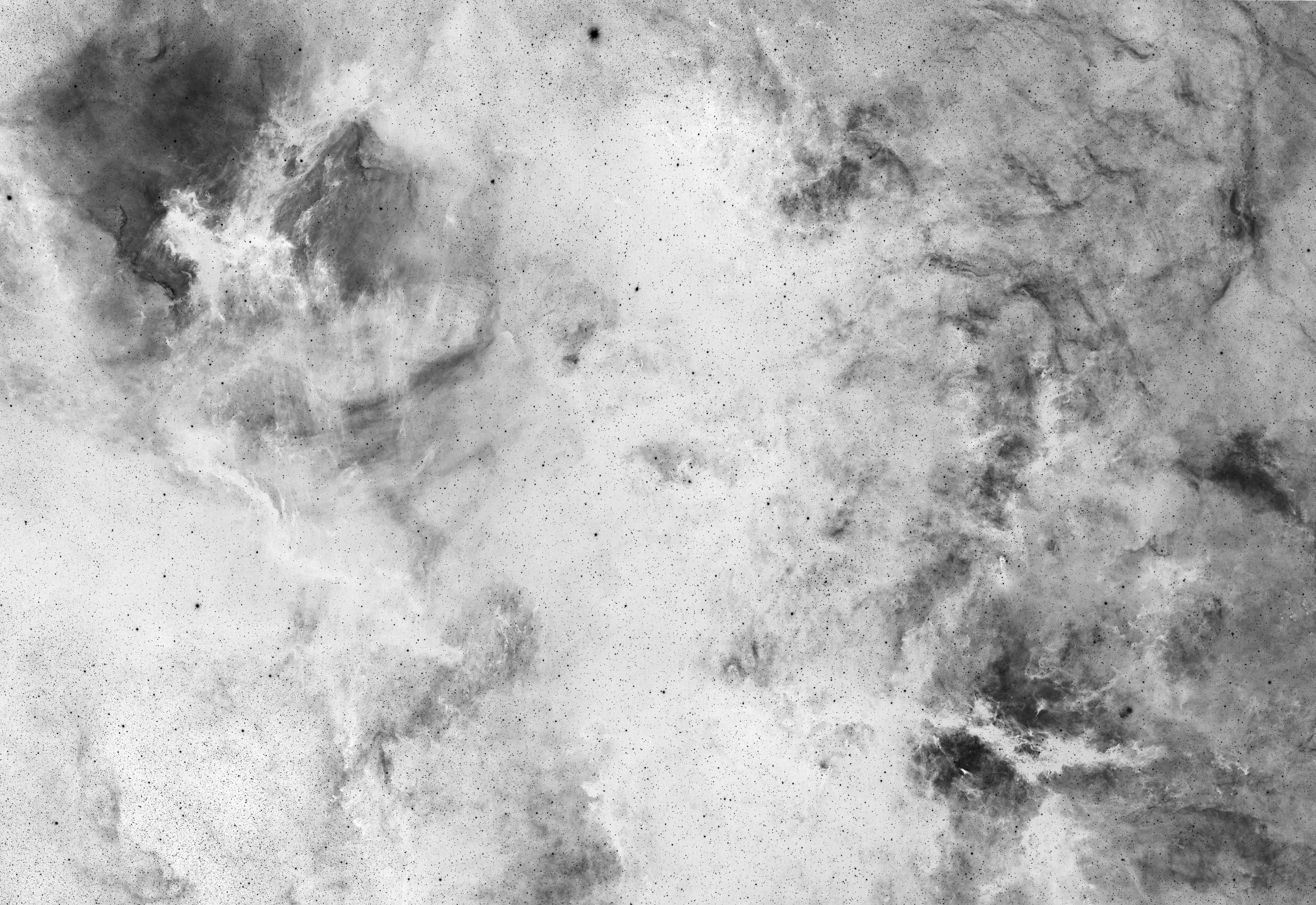NGC7000 et région Gamma Cygni- mosaïque de neuf champs Lunette FSQ106 f=530mm f:5,6 et monture F20a Axis instruments, caméra STL11000 Filtre H-alpha Astrodon 6nm Poses de 180mn (pour chaque champ : Ha = 9x20mn) Retour