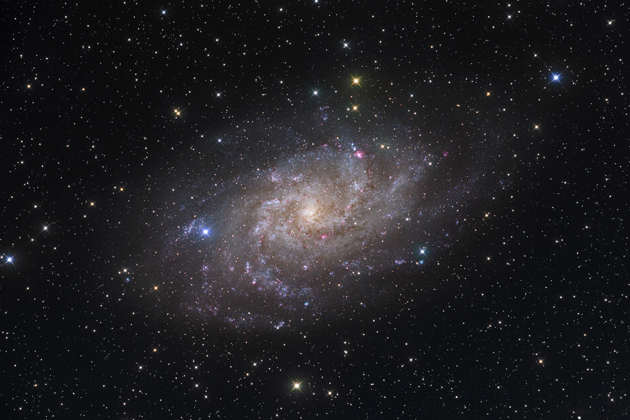 M33 en LRVB Newton-Cassegrain 300mm f:4 et monture F60a Axis instruments, caméra STL11000 Correcteur de champ Wynne Astrooptik 3 pouces Poses de 240mn avec filtres LRVB Astrodon (L : 12x5mn, RVB : 6x10mn) Retour